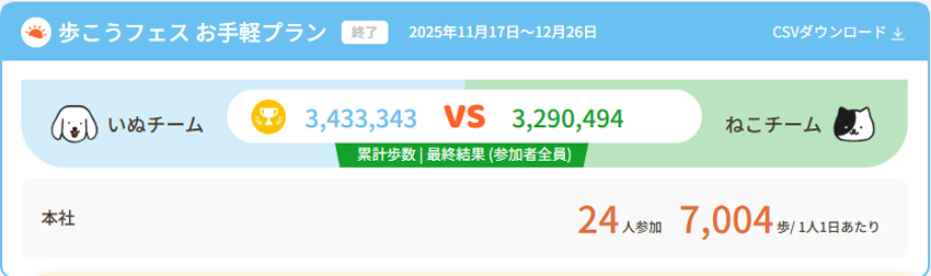 今回は いぬチームが約14万歩の大差での勝利となりました。